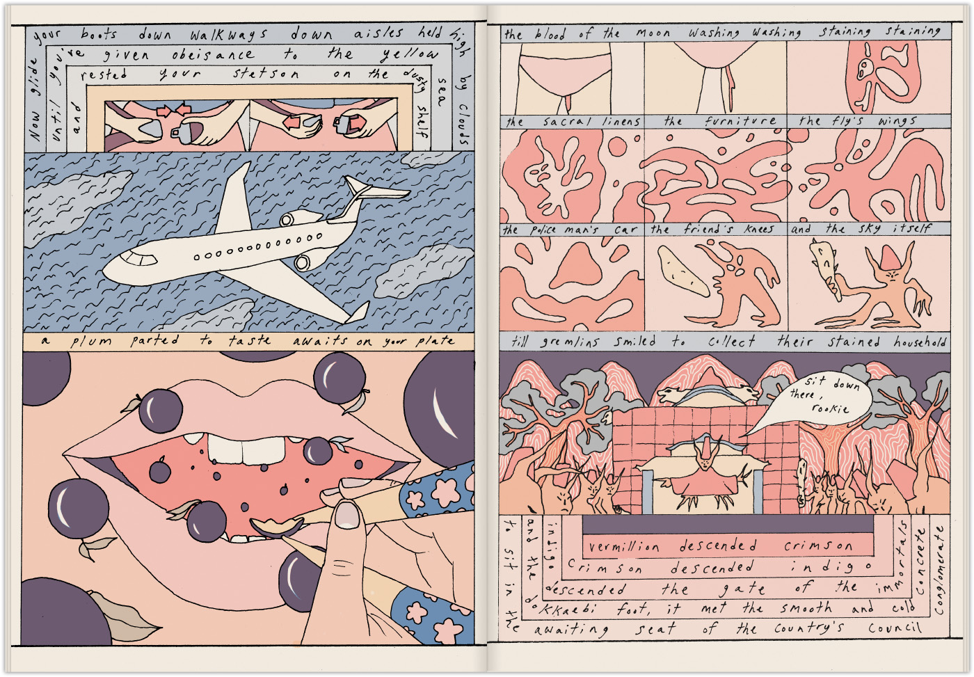 36pp 5x7" 4-color Risograph booklet in Mint, Coral, Sunflower, and Federal Blue ink on French Construction 70#T Insulation Pink & Neenah Astrobrights 60#T Stardust White.