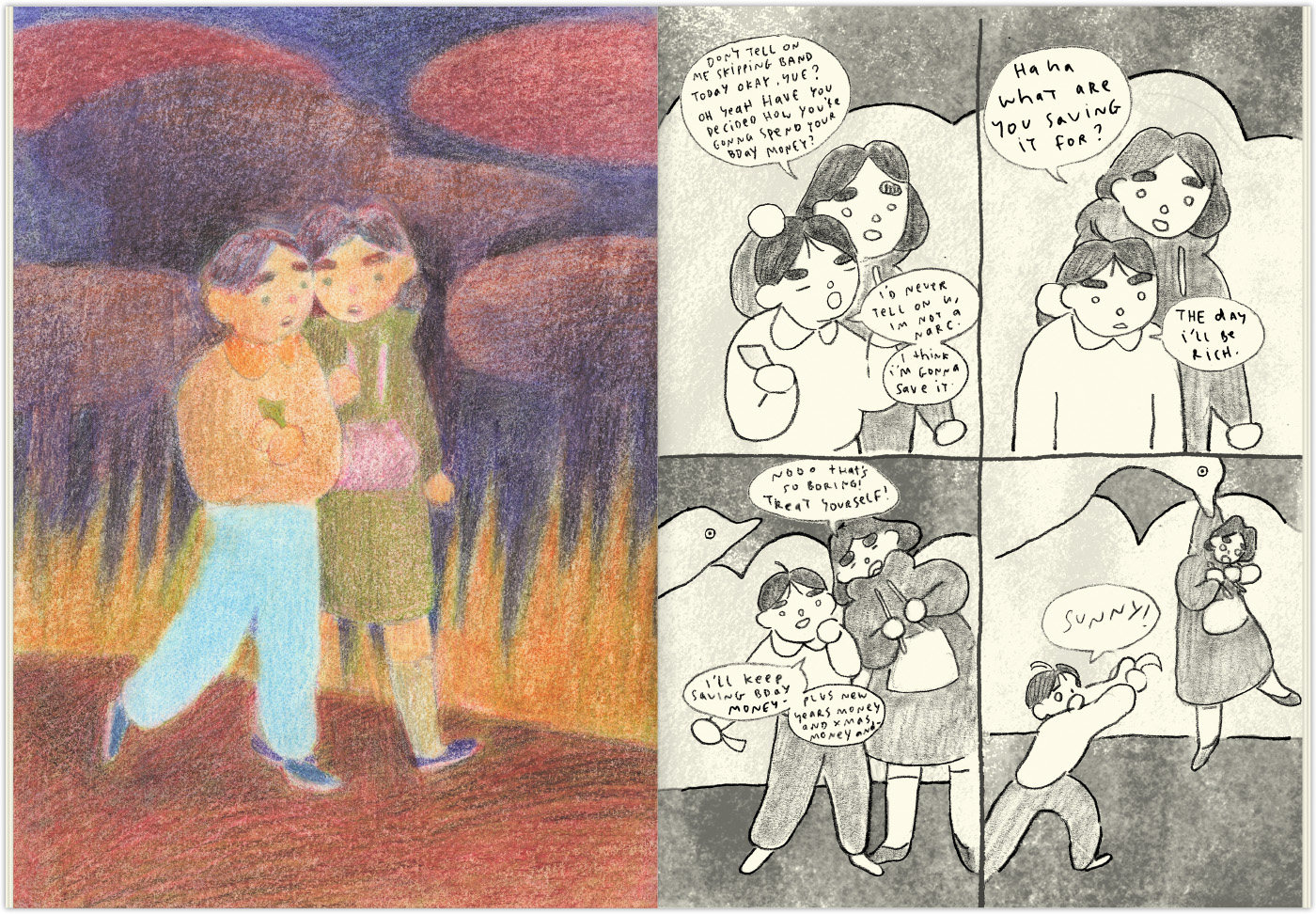 "I'm Lis, an illustrator from Toronto, Canada. The siblings in this story show up in my other comic and illustration work, and I like using them to explore stuff like relationships and growth. The format is inspired by John Martz's Gold Star, and I like how it lets me combine my detailed pencil crayon illustrations with looser cartooning. For me this is a rare project that wasn't rushed just in time for a comics show haha! I'm super grateful for this opportunity to share my work with more people :)"